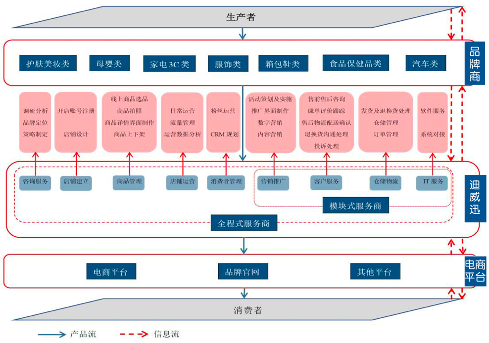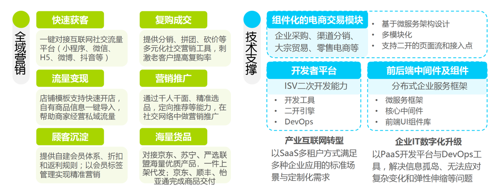 依托迪威迅在電商領(lǐng)域多年深耕所積累的運營和技術(shù)經(jīng)驗,內(nèi)部開發(fā)了SaaS模式的電商平臺,并以此為基礎(chǔ)逐步支持批發(fā)零售、品牌商城、社交電商等多種電商場景。同時,整合了供應(yīng)鏈、物流、金融、AI、大數(shù)據(jù)技術(shù)等方面的資源和能力,并將其作為增值服務(wù)賦能客戶,支持行業(yè)ISV基于PaaS平臺進行二次開發(fā)提供定制化專屬服務(wù),通過開放的跨平臺生態(tài)為客戶提供更多增值服務(wù)。主要服務(wù)于零售電商、品牌電商和社交電商三大場景,針對企業(yè)采購、銷售的成本、效率和體驗提供一站式服務(wù)。