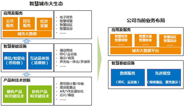 近幾年來,基于對國家城鎮(zhèn)化發(fā)展趨勢、構(gòu)成要素及演進方向的理解,迪威視訊對業(yè)務構(gòu)成進一步梳理,以數(shù)據(jù)服務和先進視覺兩大類智慧基礎能力為支撐,重點布局智慧城市大生態(tài)的多個應用領域,著力構(gòu)建“兩類智慧基礎能力+多種應用服務”的業(yè)務協(xié)同架構(gòu)。
