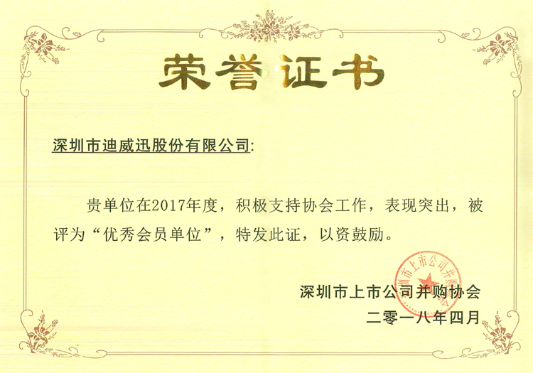 圖2 迪威迅獲頒“優(yōu)秀會員單位”證書