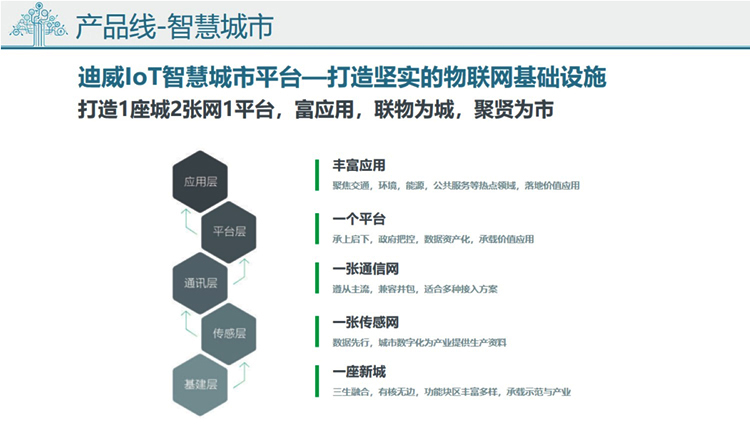 在新型智慧城市建設(shè)進程中,迪威迅依托IOT智慧物聯(lián)網(wǎng)平臺,通過物聯(lián)網(wǎng)、大數(shù)據(jù)、云計算、人工智能等新一代信息技術(shù)與城市基礎(chǔ)設(shè)施的創(chuàng)新與融合,助力城市智慧化升級。