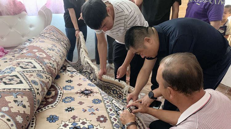 隨后駐村工作隊(duì)帶領(lǐng)大家來(lái)到瓊庫(kù)爾艾日克村地毯廠參觀并詳細(xì)講述制作地毯的工藝以及地毯廠的運(yùn)營(yíng)模式。我司副總裁表示:手工羊毛地毯品質(zhì)優(yōu)良,應(yīng)發(fā)揮自身企業(yè)的優(yōu)勢(shì),幫扶地毯廠搭建產(chǎn)地直供的銷路平臺(tái),將和田地區(qū)的好產(chǎn)品輸送到全國(guó)甚至出口。
